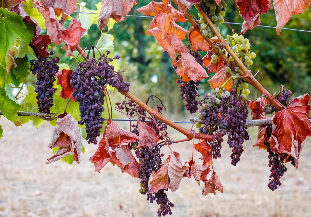 - Sécheresse et coups de soleil : brûlures sur grappes, blocages de maturation, baisse de qualité organoleptique.